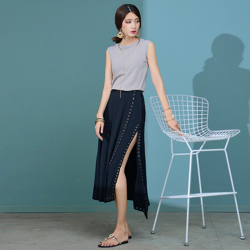 简单的裙面上加以铆钉的装饰将时尚的气息带给你,采用的是单侧高开叉的设计不仅很显独特还能够带出你的性感气息来,让你在行走中尽显美丽。