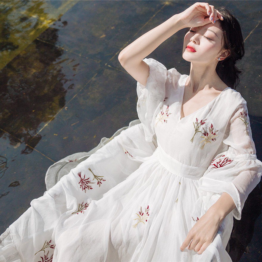 1、白色刺绣连衣裙。 这件单品很具有大牌感,白色连衣裙让你看起来更显温婉典雅,麦穗图案的刺绣印花为单品注入清新之感,V领设计露出纤细的锁骨,让你更显妩媚迷人,喇叭袖的设计也能帮我们修饰手臂线条。